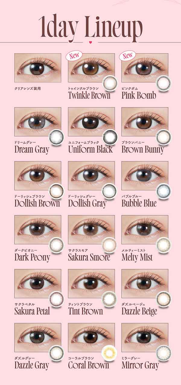◆着色直径:(11.9mm:コーラルブラウン)(12.8mm:ダズルベージュ、ダズルグレー)(13.0mm:ミラーグレー)(13.2mm:ドーリッシュブラウン、ドーリッシュグレー)(13.3mm:サクラペタル、ティントブラウン)(13.4mm:バブルブルー)(13.5mm:サクラスモア、メルティーミスト)(13.6mm:ブラウンバニー)